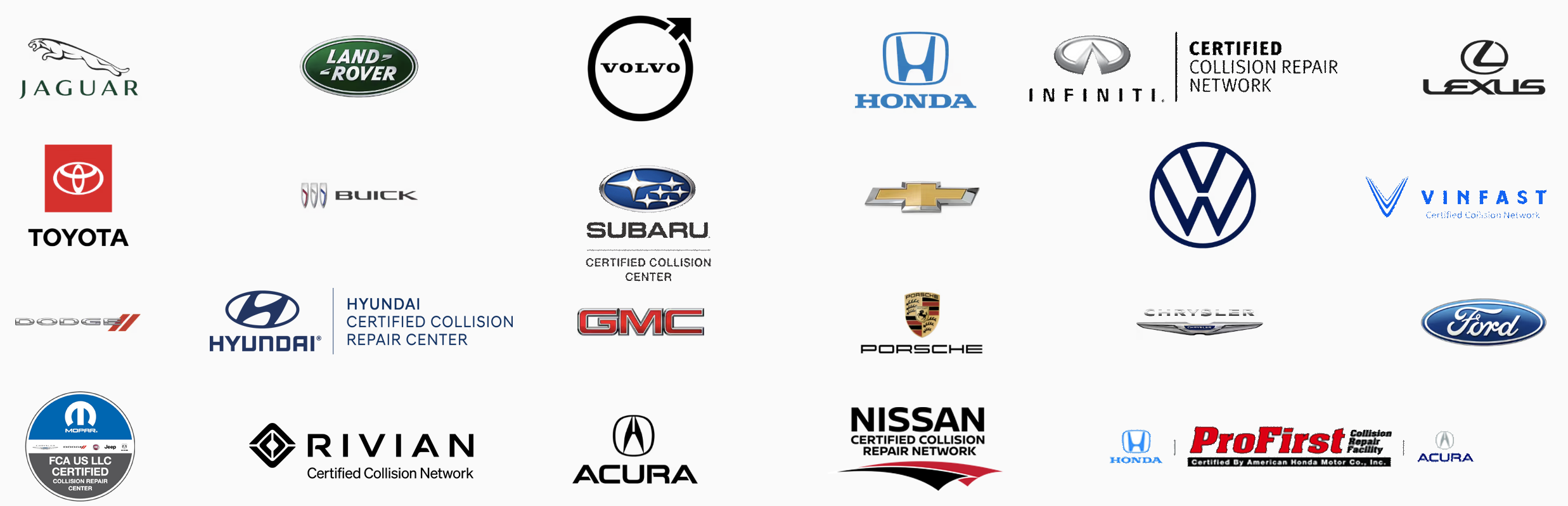 ✅ Manufacturer Certified Collision Repair – Certified by Porsche, Jaguar, Land Rover, Volvo, Lexus, Rivian, Honda, Acura, Buick, Toyota, General Motors (GMC, Chevrolet, Cadillac), Vinfast, Volkswagen, Ford, Hyundai, Nissan, FCA (Dodge, Jeep, Ram, Chrysler, Mopar, Fiat)